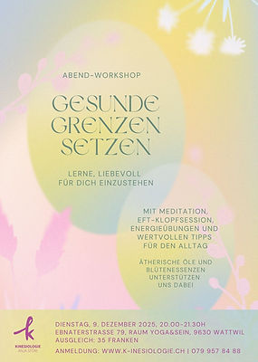 Am 9. Dezember 2025 findet mein Workshop "Gesunde Grenzen setzen" in Wattwil statt. Das Thema Abgrenzung und für sich einstehen begegnet mir sowohl in der Praxis als auch im privaten Umfeld sehr häufig. Deshalb freue ich mich sehr, diesen Abend mit euch gemeinsam diesem wichtigen Thema zu widmen.